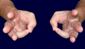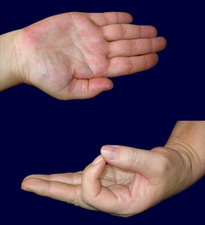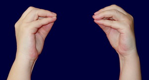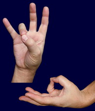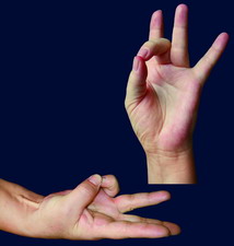 - radi se sa obe šake isto, palac se osloni na 2. falangu kažiprsta, ostali prsti pruženi