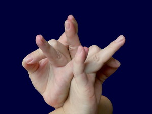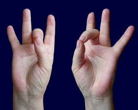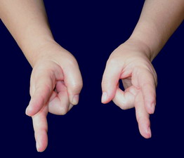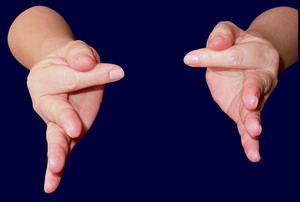 - saviti domali i mali prst na dlan i osloniti palac na njih, ostali pruženi, obe šake isto